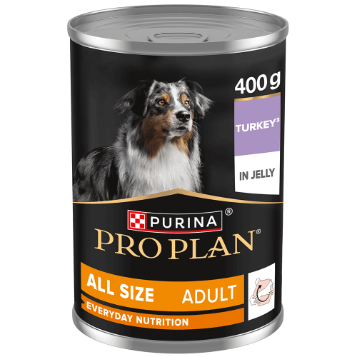 PURINA® PRO PLAN®. Консервований повнораціонний корм для дорослих собак будь-якого розміру, з індичкою. Шматочки у желе. До складу консервованих кормів для собак PURINA® PRO PLAN® входять високоякісні інгредієнти, такі як індичка або риба. Цей повнораціонний консервований корм був спеціально розроблений, щоб задовольняти харчові потреби Вашого улюбленця, як одного з аспектів здорового способу життя. Він допомагає підтримувати здорові суглоби для активного способу життя, а також допомагає підтримувати шерсть блискучою від коренів до кінчиків. Високий вміст протеїну (92% тваринного протеїну від загальної кількості протеїну у складі) допомагає підтримувати міцні м'язи та оптимальну форму тіла. Консервований повнораціонний корм PURINA® PRO PLAN® підходить для дорослих собак будь-якого розміру і містить клітковину для підтримання здорового травлення Вашого собаки.