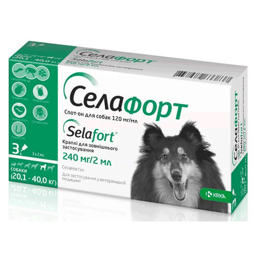 KRKA Селафорт Краплі на холку проти зовнішніх і внутрішніх паразитів для собак від 20 до 40 кг, 240 мг/2мл,1 піпетка