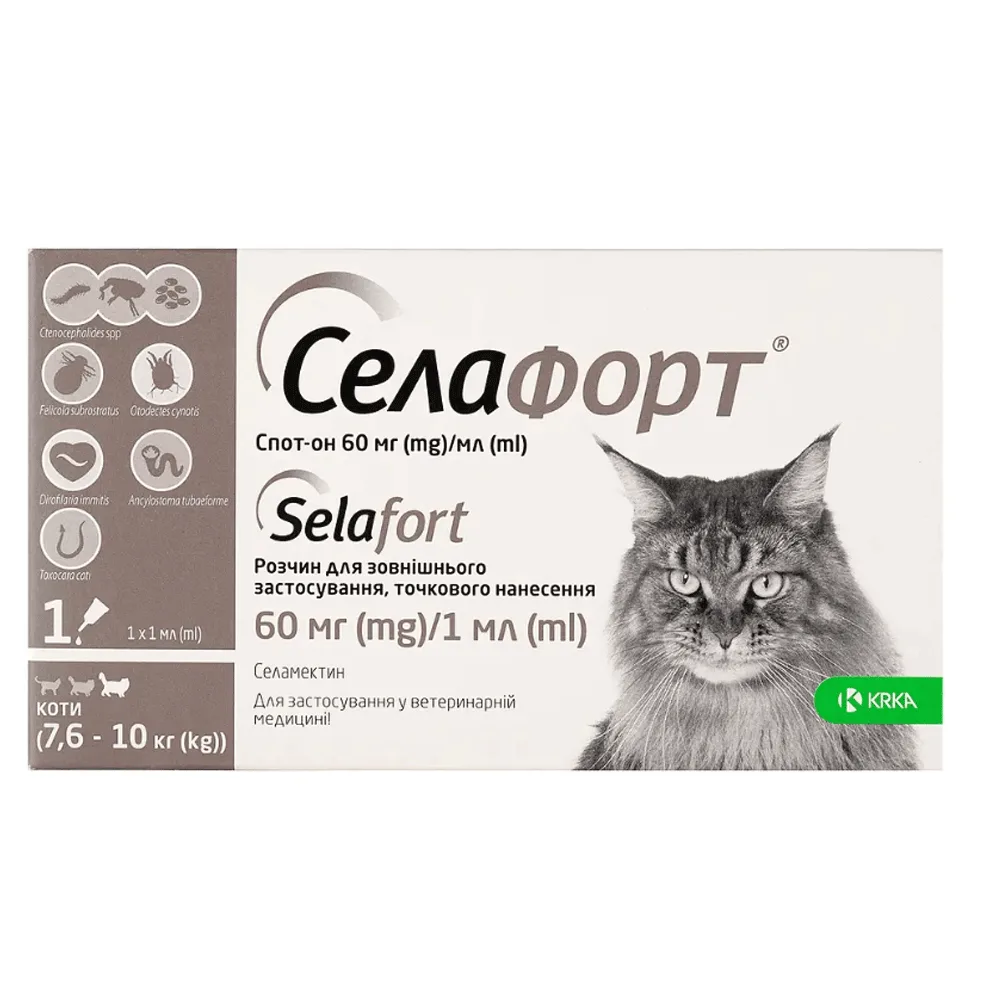 Краплі на холку KRKA Селафорт від зовнішніх і внутрішніх паразитів для котів вагою 7,5- 10 кг №1 - застосовують для профілактики та лікування при зараженні блохами, вошами, волосоїдів, отодектозу, дирофіляріоз, токсокароз, анклілостомозом.