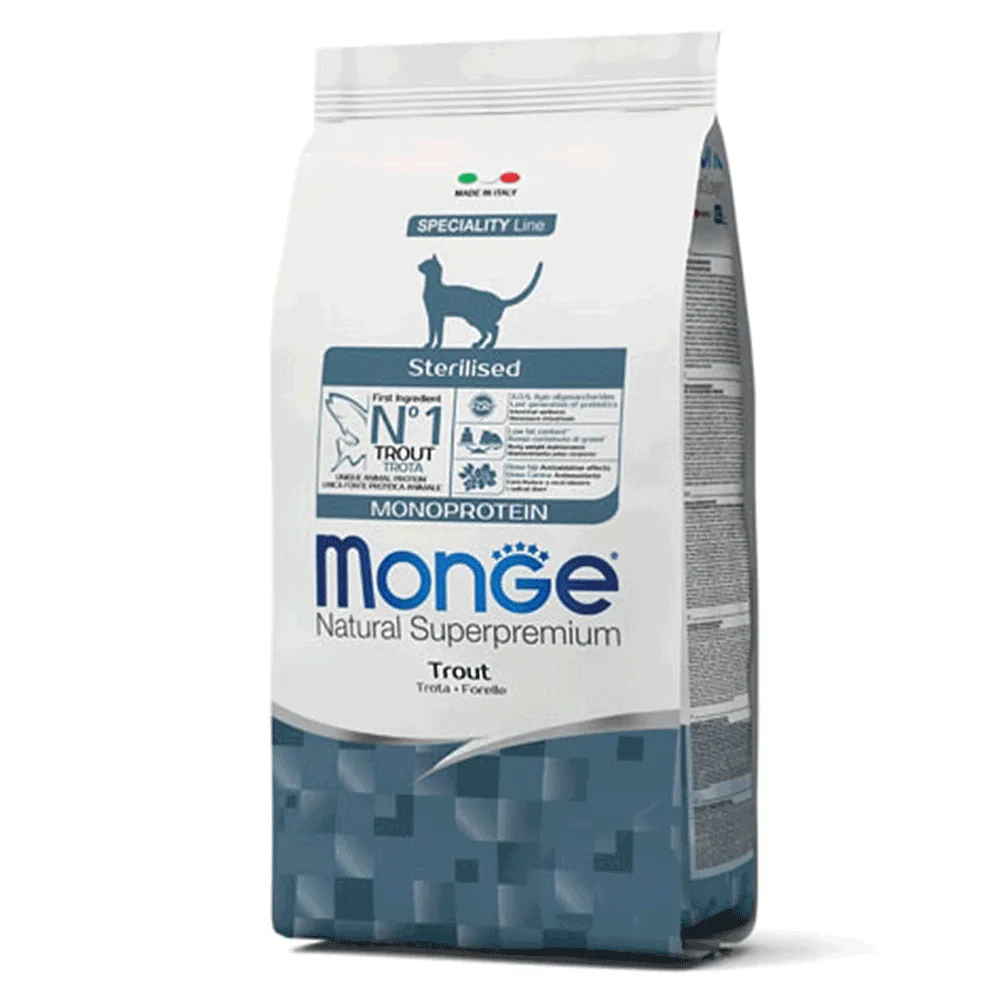 Monge Superpremium Monoprotein Sterilised Trout - це повноцінний збалансований раціон для стерилізованих кішок.