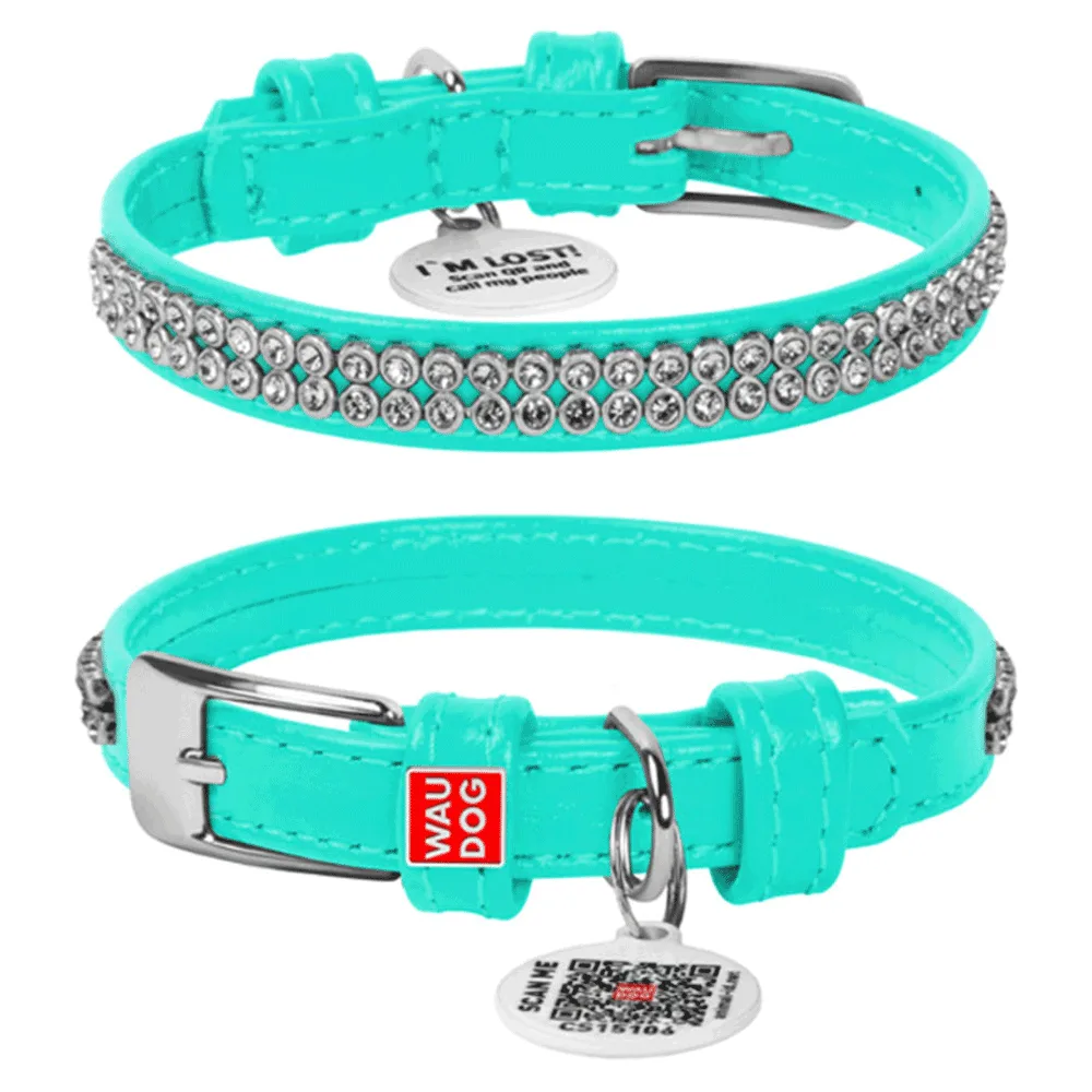 Нашийник для собак шкіряний WAUDOG Glamour з QR паспортом Полотно стрази 21-29 см/12 мм, ментоловий