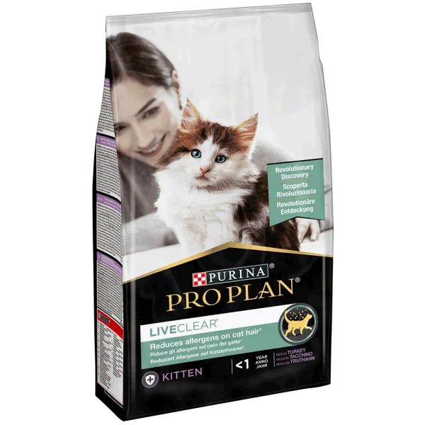 Основні переваги: PRO PLAN® LiveClear® Kitten для кошенят молодше 1 року, забезпечує смачне повнораціонне та збалансоване харчування, яке безпечно та ефективно знижує алергени на шерсті та лупі котів, починаючи з третього тижня безперервного годування.