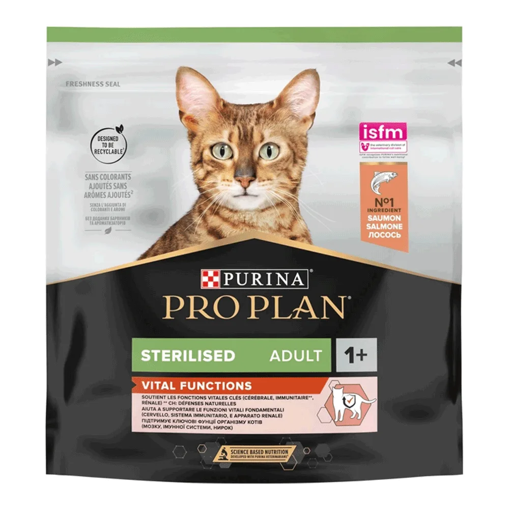 Сухий повнораціонний корм для дорослих стерилізованих кішок та кастрованих котів PRO PLAN® Sterilised Adult 1+ Vital Functions з лососем. Для підтримки здорового сечовипускання та оптимальної ваги тіла. Підтримує силу імунної системи та сприяє здоров'ю функції нирок. Збагачений спеціальними поживними речовинами для підтримки виконавчих функцій мозку (логічне мислення, вирішення проблем, функція пам'яті та адаптація до нових ситуацій).