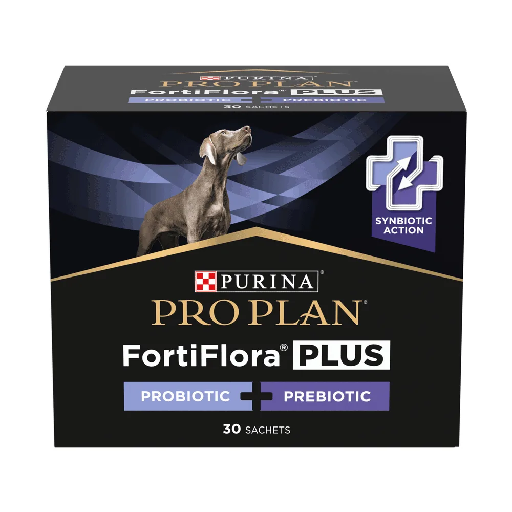 PURINA® PRO PLAN® FortiFlora® PLUS (Плюс) - додатковий корм для дорослих собак та цуценят (після відлучення від матері) із синбіотичною дією пребіотика та пробіотика.