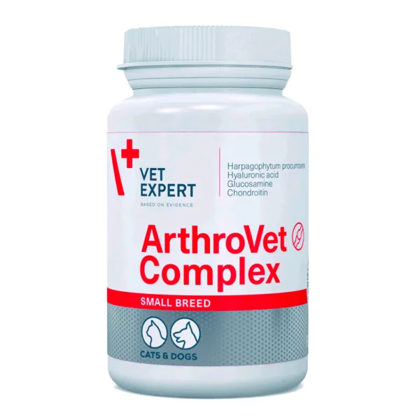 Vet Expert ArthroVet Complex Small breed&cats (Вет Експерт Артровет Комплекс для котів і собак малих порід) – харчова добавка для котів і собак малих порід із порушеннями функції хрящів і суглобів. Підходить для молодих, дорослих і зрілого віку тварин, особливо при ортопедичних травмах, перед ортопедичними процедурами та у період одужання.