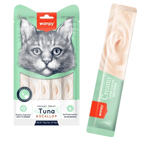 Wanpy Creamy Lickable Treats Tuna & Scallop – натуральні рідкі ласощі для котів на основі елітного тунця і делікатесного морського гребінця. Це справжнє смакове задоволення для пухнастих рибних гурманів. Ласощі мають ніжну кремову консистенцію і призначені як смачне та корисне доповнення до основного раціону котів і кошенят усіх порід віком від 3-х місяців.