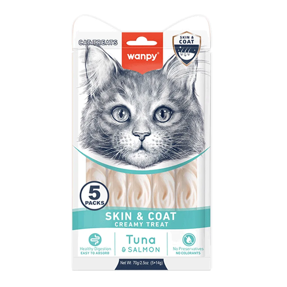 Wanpy Skin&Coat ШКІРА Й ШЕРСТЬ – це функціональні рідкі ласощі з тунцем і лососем, розроблені для підтримання здоров’я шкіри та шерсті у котів усіх порід.