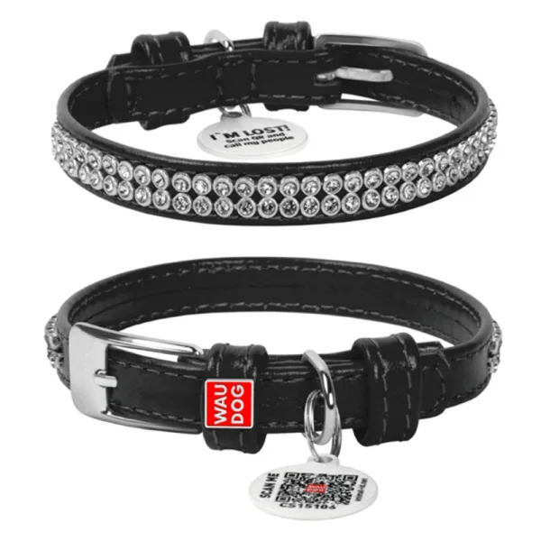 Нашийник для собак шкіряний WAUDOG Glamour з QR паспортом Полотно стрази 18-21 см/9 мм (чорний)