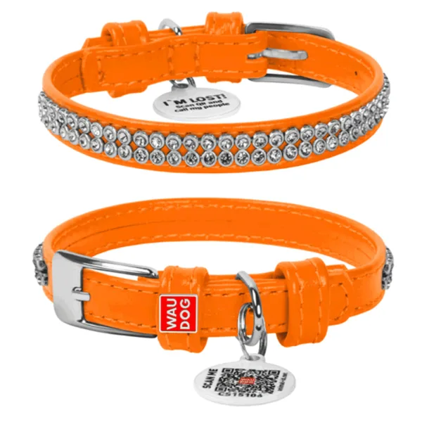 Ошейник для собак кожаный WAUDOG Glamour с QR паспортом Полотно стразы 21-29 см/12 мм (оранжевый)