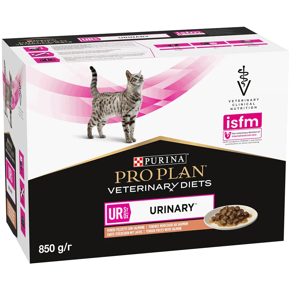 Влажный диетический корм PRO PLAN VETERINARY DIETS UR ST/OX Urinary для взрослых кошек для растворения и снижения образования струвитных камней, кусочки в соусе, с лососем, 10х85 г
