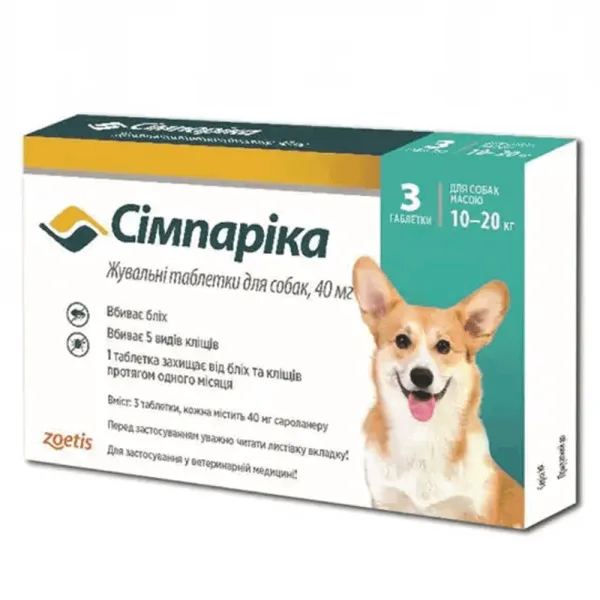 Симпарика Жевательные таблетки от блох и клещей для собак весом от 10,1 до 20 кг, 40 мг 1 таблетка