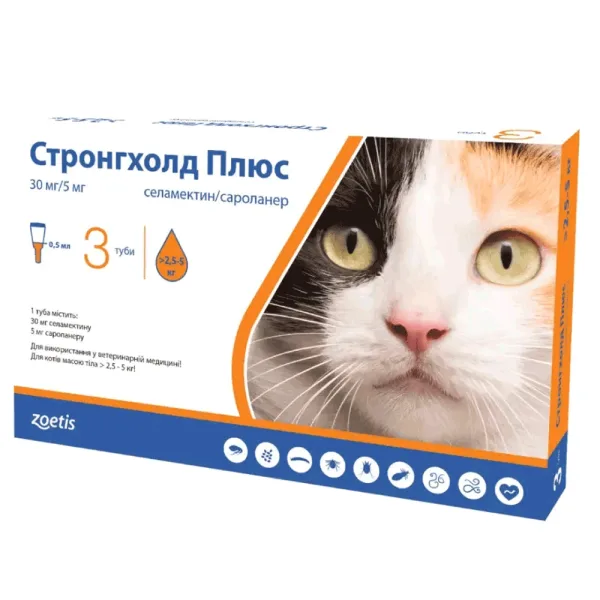 Стронгхолд Плюс Противоразитарные капли на холку для кошек 2,5 до 5 кг, 30 мг/5 мг, 3 пипетки